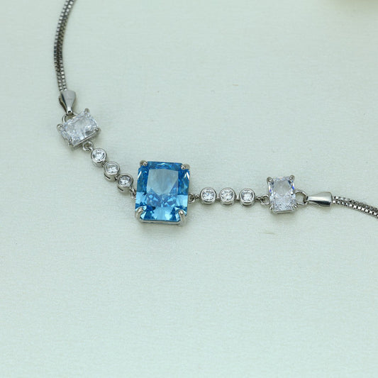 This elegant 92.5 sterling silver bracelet features a striking rectangular light blue gemstone at the center, held securely in a four-prong setting. On each side of the center stone, the bracelet is adorned with sparkling white rectangular stones, adding extra brilliance and balance to the design. The row of round...