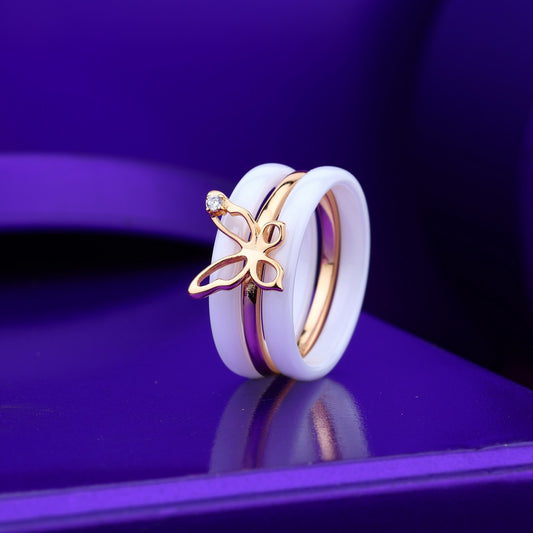This stunning white ceramic ring set features a unique and elegant combination of two plain white ceramic bands paired with a beautifully crafted butterfly accent ring in the center. the butterfly is delicately shaped with an open airy design and topped with a sparkling stone, adding a touch of charm...