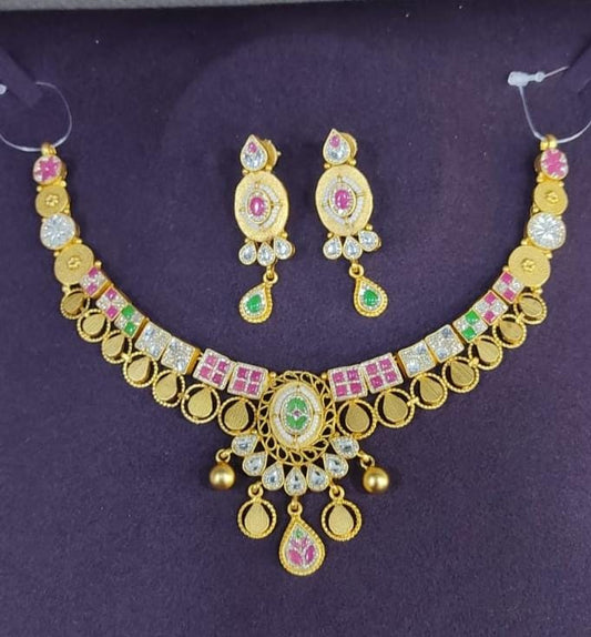 ✨This elegant necklace set is crafted in pure 925 silver with a long-lasting premium golden polish. The design features a stunning mix of ruby pink, emerald green, and Swarovski white stones, giving it a rich traditional look.The intricate detailing, oval centre motif, and matching earrings make it perfect for weddings,...