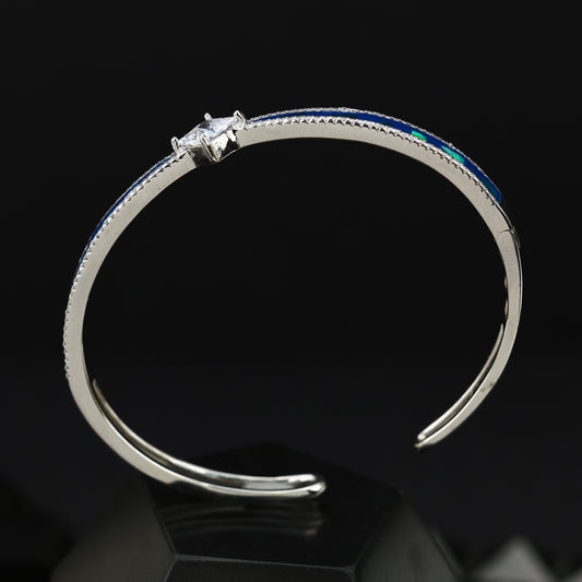 Experience elegance with a touch of bold colour — presenting our 92.5 Sterling Silver Blue Inlay Bracelet, crafted for those who love statement minimalism.Highlighted with a stunning blue opal-inspired inlay, this bracelet reflects light beautifully, capturing deep ocean hues and iridescent shine. The center features a brilliant-cut stone that adds...