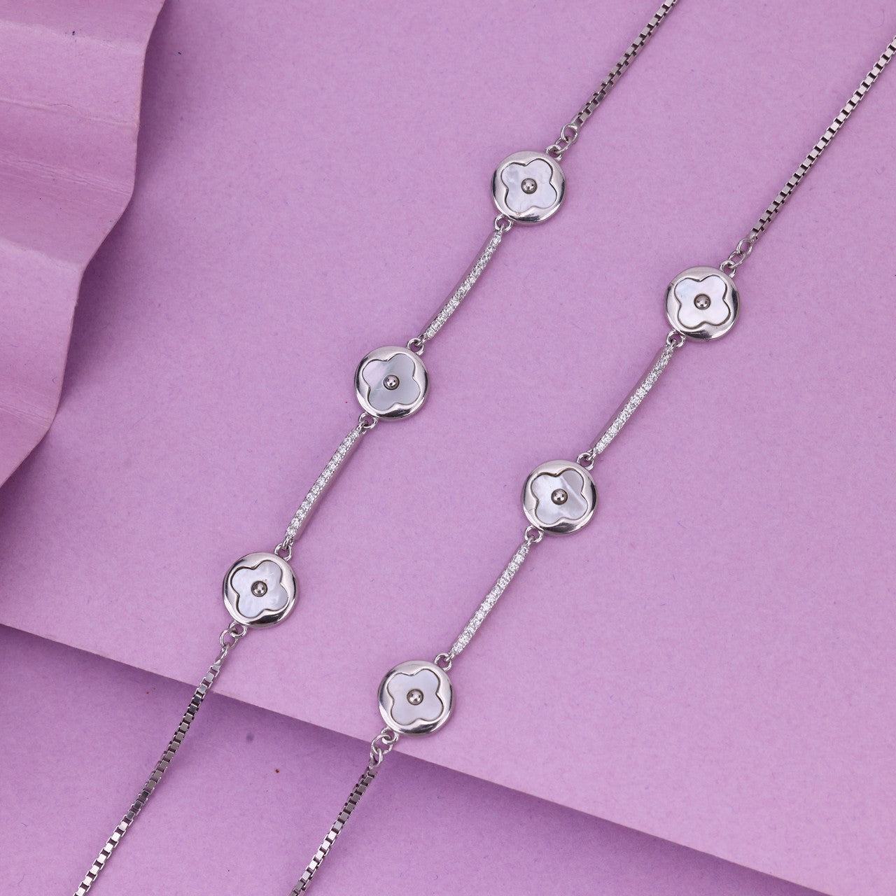 Elevate your jewelry collection with this stunning 925 sterling silver Mother of Pearl anklet, designed with elegant floral MOP motifs and sleek bar links. The natural shimmer of Mother of Pearl adds a luxurious glow, making this anklet perfect for both festive and everyday wear.