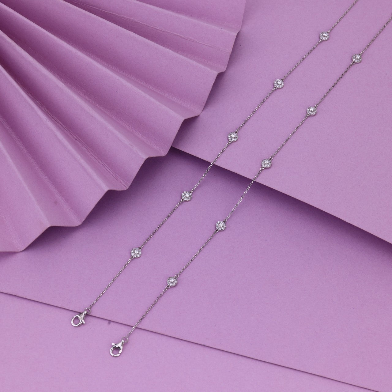 Elevate your everyday style with this 92.5 Sterling Silver Anklet, featuring beautifully spaced CZ sparkle clusters placed along a sleek silver chain. The minimalist design adds just the right amount of shimmer, making it perfect for daily wear as well as festive occasions. Crafted with premium sterling silver, it is lightweight, durable and gentle on the skin.