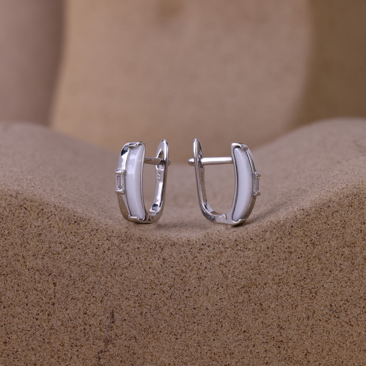 A chic j-style lock earring featuring a modern dual side design-smooth white ceramic on one side and polished 925 silver on the other. the center holds a single square-cut sparkling stone for a clean, minimal luxury look. perfect for daily wear. western outfits and gifting.