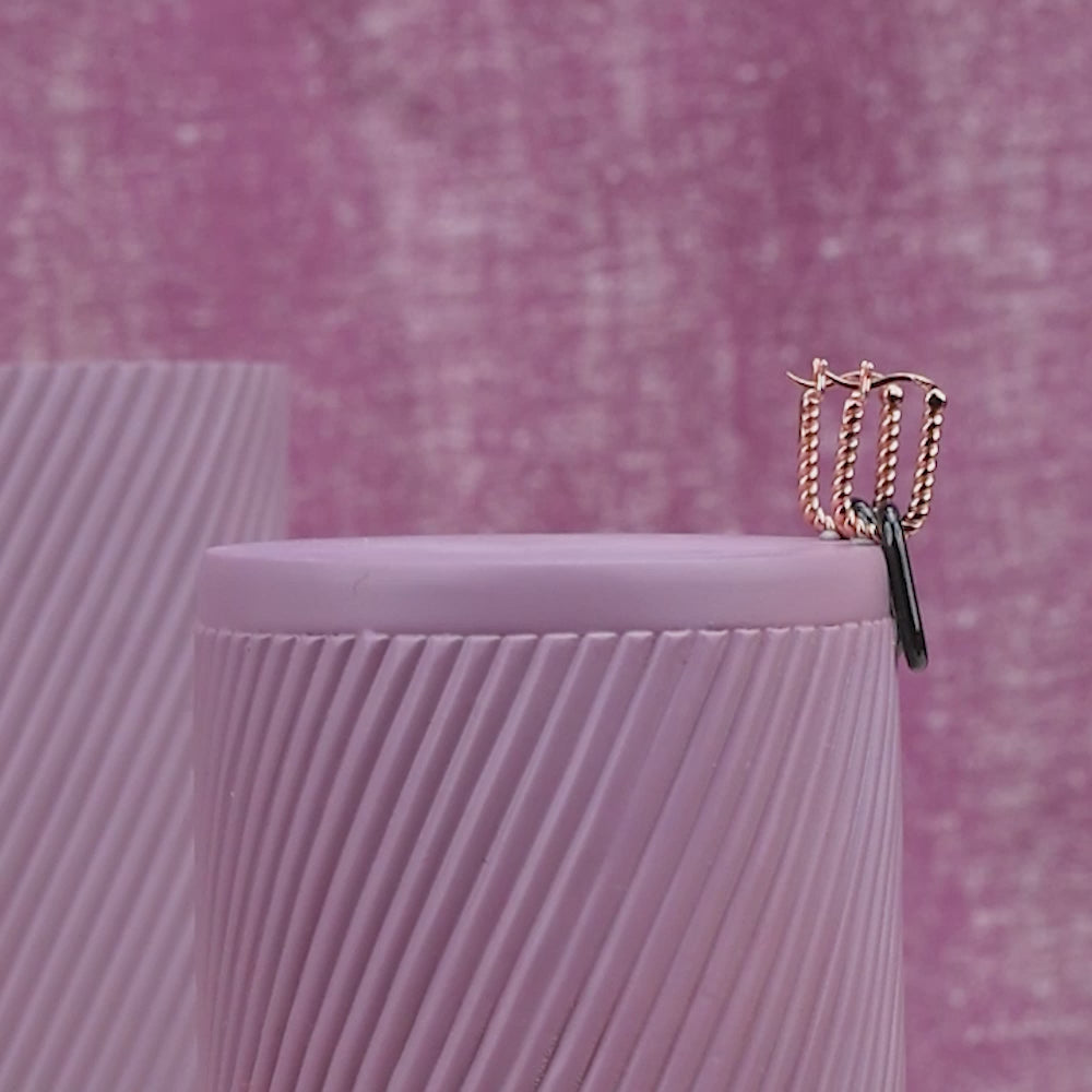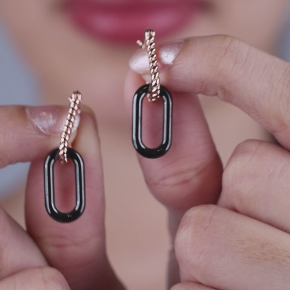These 925 silver earrings feature a stunning dual chain design-- shimmering silver on top and sleek black ceramic below. the lock earrings style adds comfort with a modern twist.