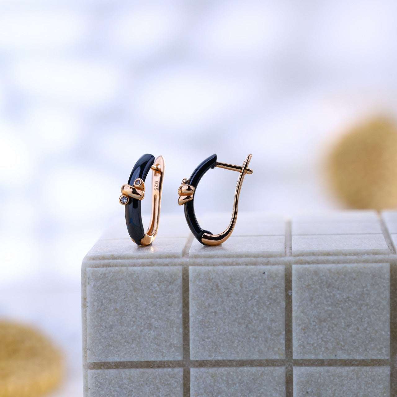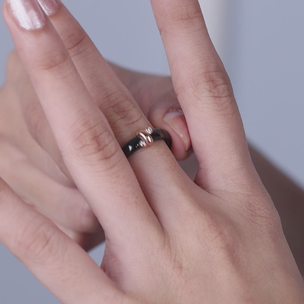 "The perfect blend of balance and brilliance crafted in glossy black ceramic with twin round stones that create a graceful infinity effect".