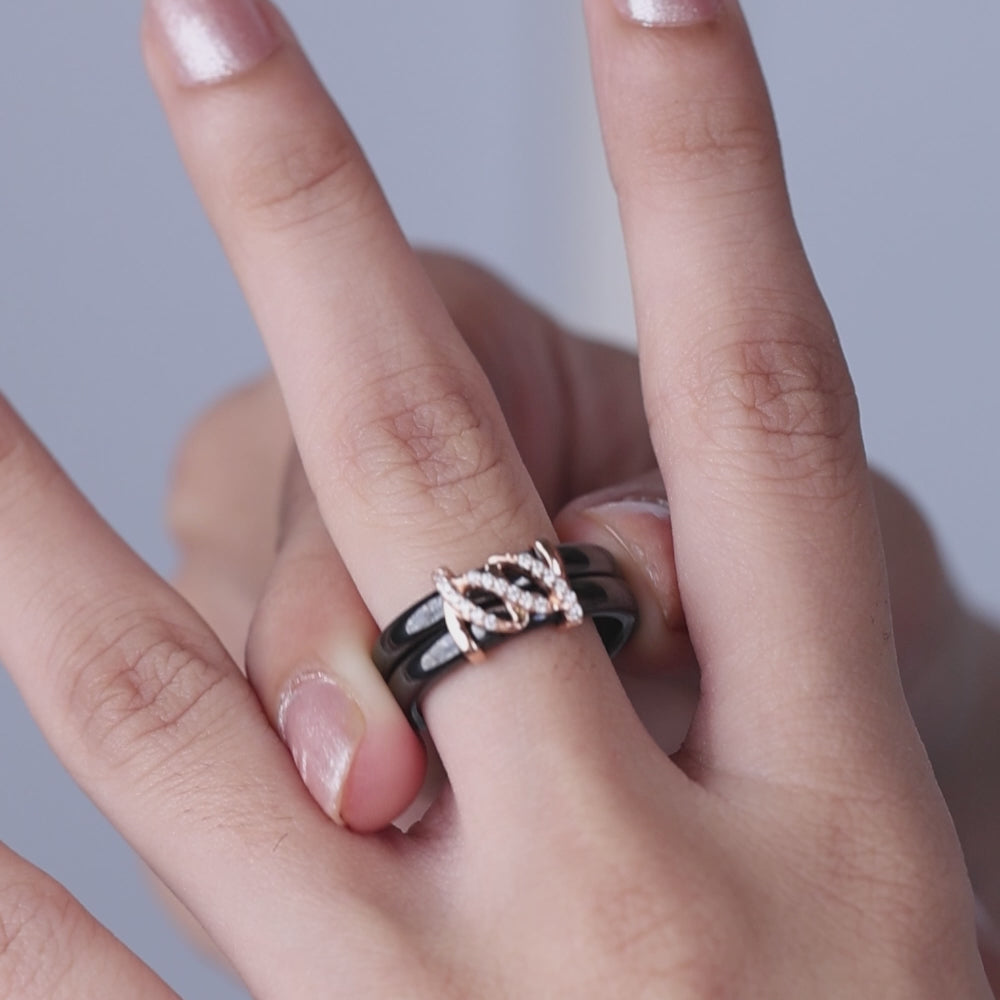 "Sleek, modern and effortlessly chic- the swirling rose- gold detailing on black ceramic reflects confidence and timeless charm in every detail".