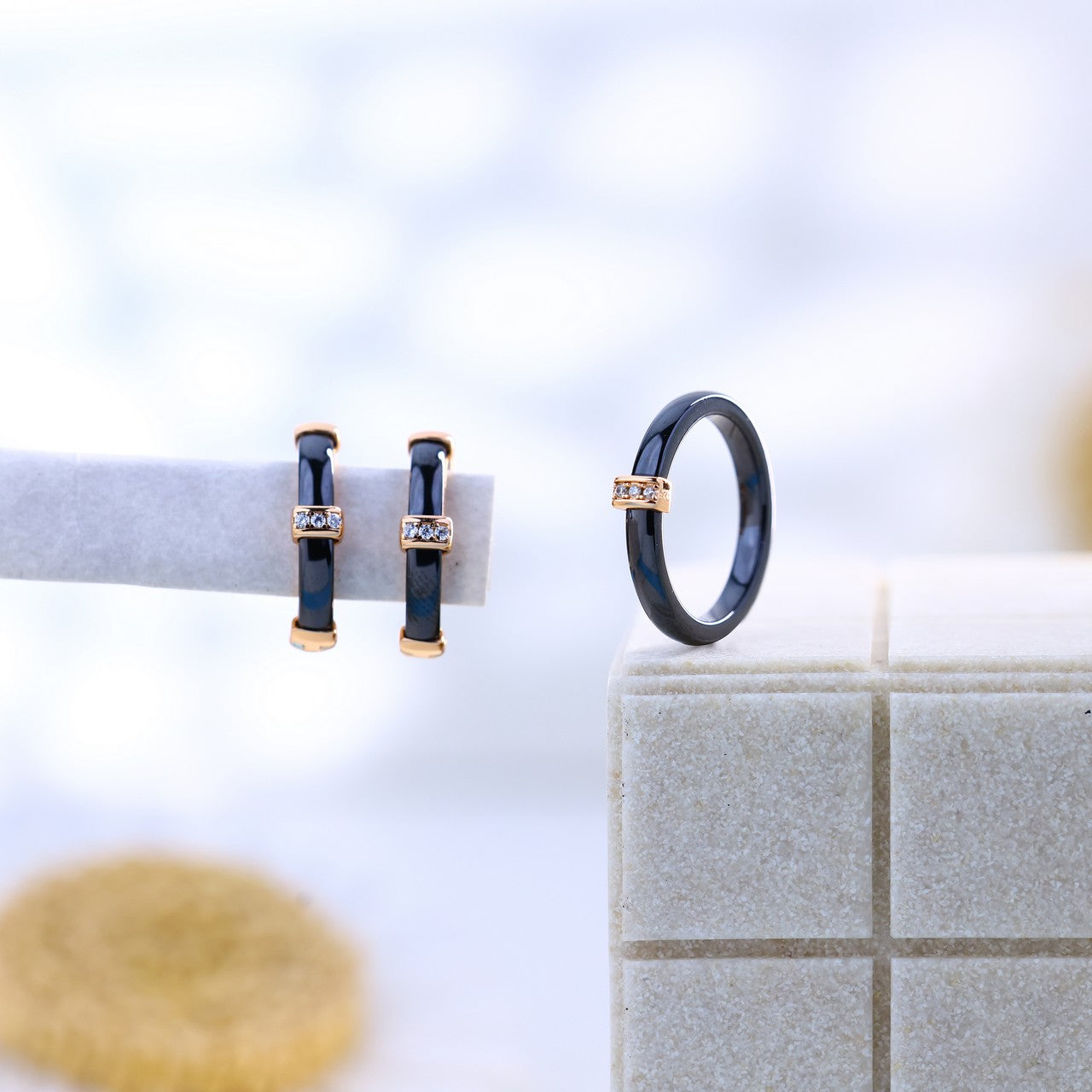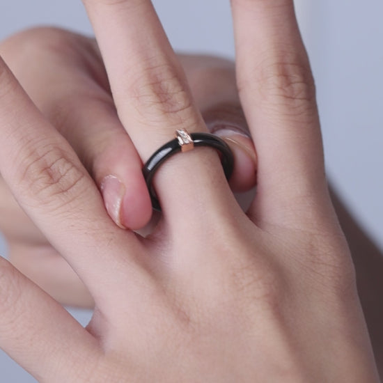 "Crafted for modern elegance the sleek black ceramic band meets a sparkling rose-gold charm reflects confidence and effortless style"