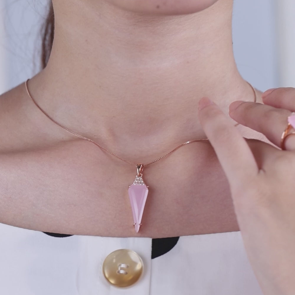 The ethereal rose set brings together elegance and edge. each piece showcases a pastel pink stone in a sleek triangular design -- minimal yet mesmerizing made for the women who loves modern luxury.