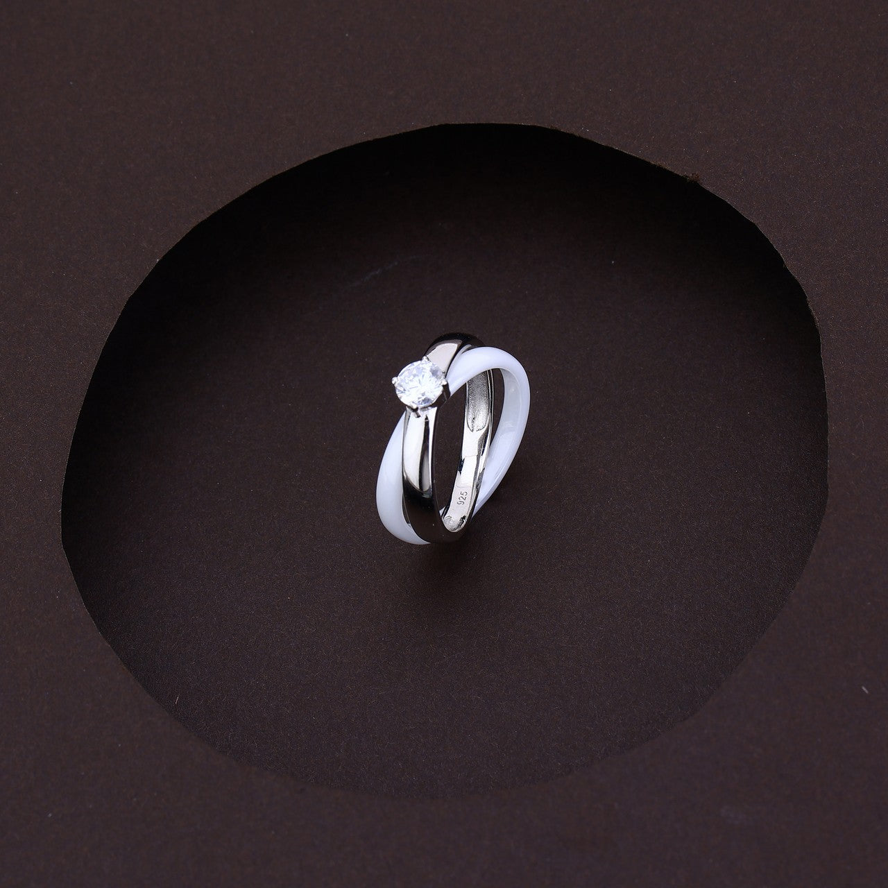 TWO MOODS, ONE DESIGN. The 2-in-1 ring and matching earrings blend minimal white ceramic with a sparkling solitaire-- symbolizing purity and confidence in every look.