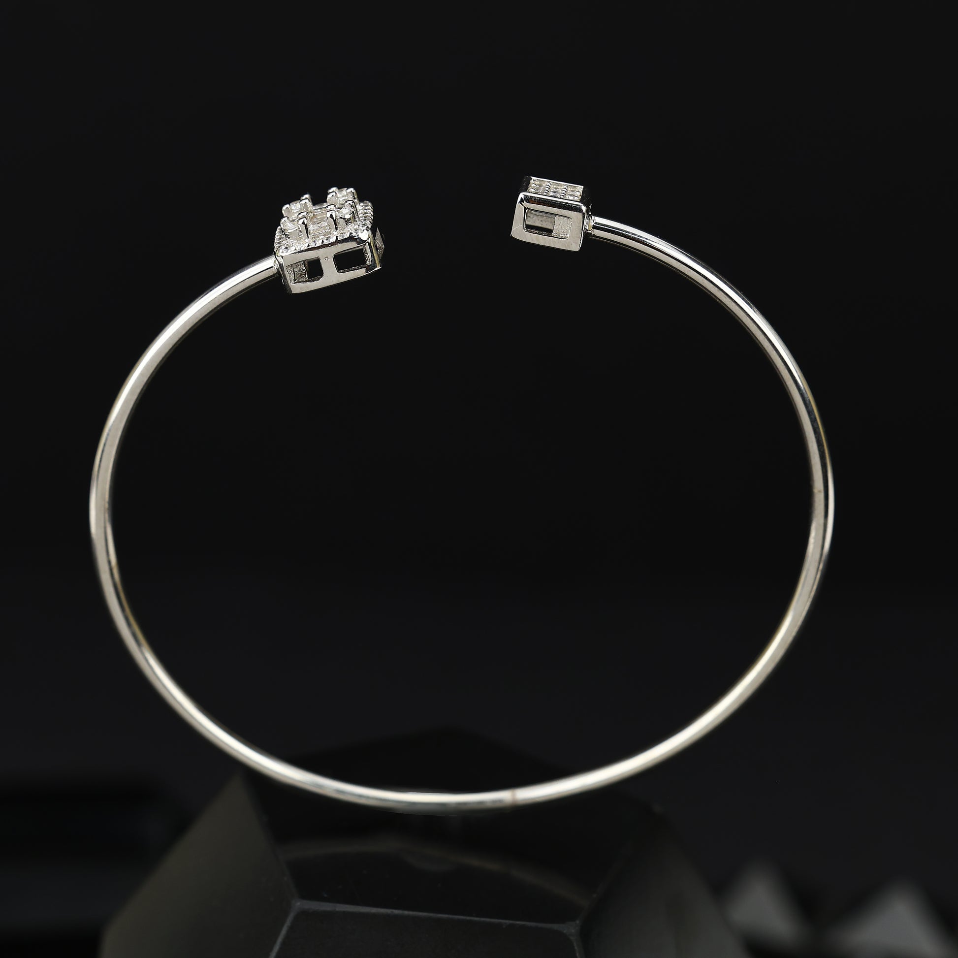 Elevate your everyday style with our 92.5 sterling silver open bangle bracelet, crafted with a modern dual-stone design. featuring a stunning baguette-cut halo stone paired with a sparkling square pave setting. this bracelet blends minimal elegance with a touch of luxury. its open-end structure gives it a light, refined and contemporary look, making it the perfect accessory for both daily wear and special occasions.