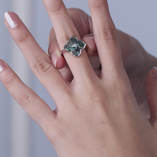"A captivating 92.5 silver jewelry set featuring a clover- shaped design with a mesmerizing abalone finish and a sparkling stone at the center -- a perfect blend of elegance and modern artistry."