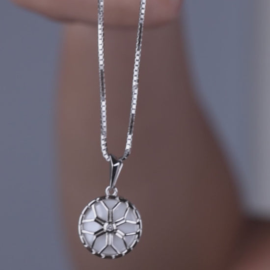 A beautifully crafted 925 silver pendant featuring a floral wheel design, highlighted with a sparkling centre stone. its clean white enamel base and intricate metal detailing create a soft, elegant look- perfect for daily wear as well as special occasions. available in both classic 925 silver and luxurious rose silver finishes.