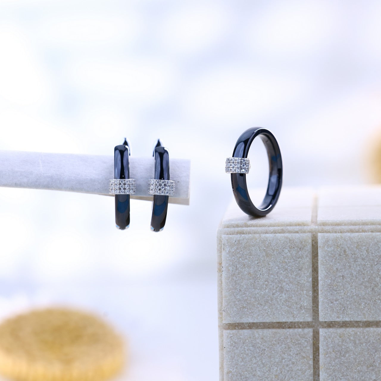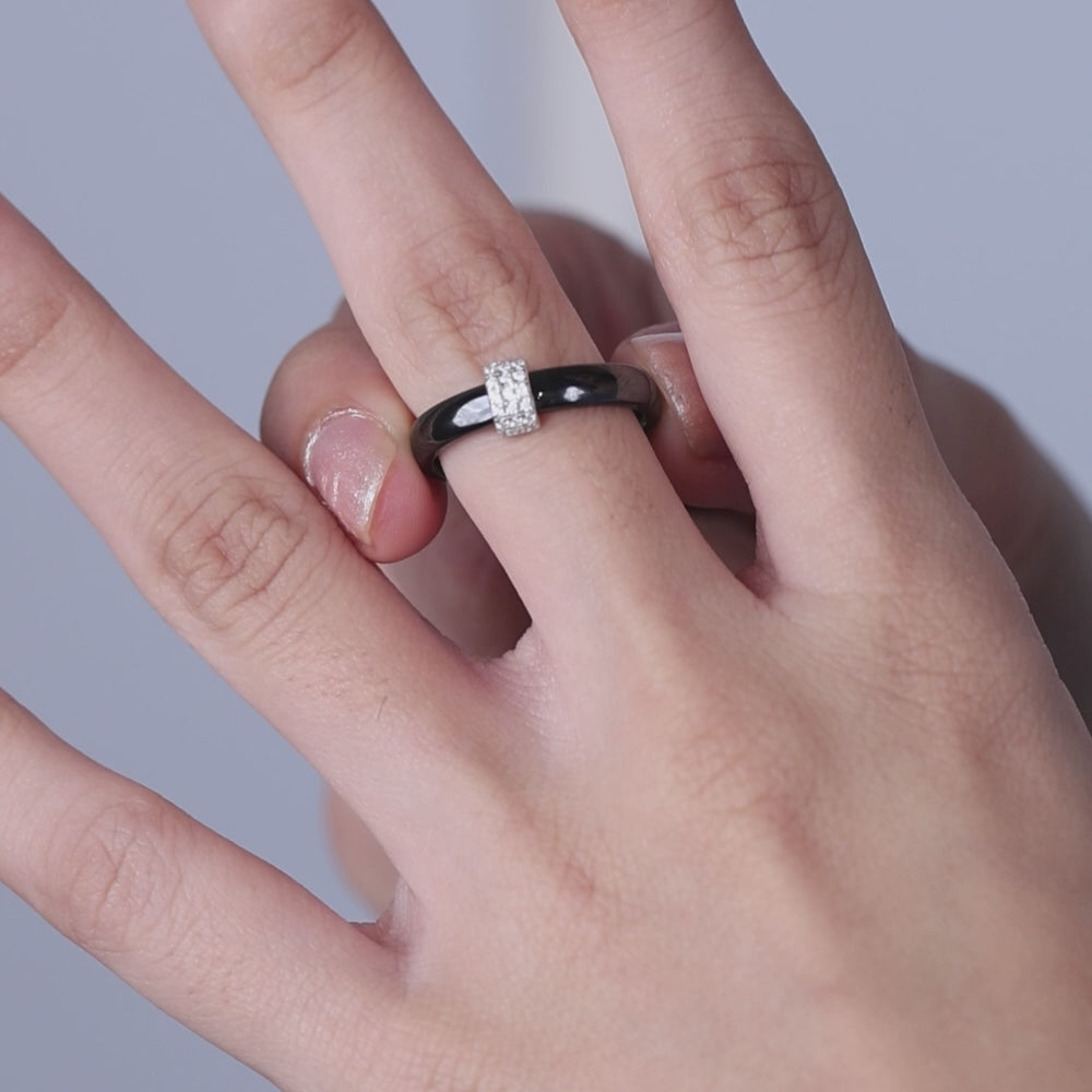"Designed with precision and poise-- the square diamond detailing on sleek black ceramic adds a refined edge to your everyday elegance".