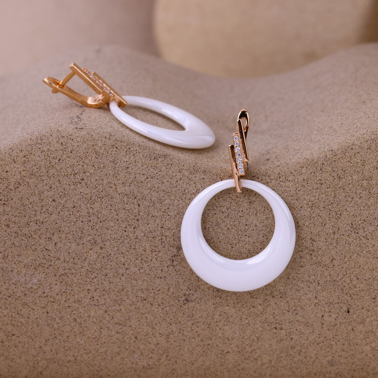 These stunning earrings combine the charm of white ceramic with the warm glow of rose silver metal. The center bar is adorned with shimmering stones. perfectly complementing the soft rose tone and adding a beautiful hint of sparkle. the lock-style top enhances the overall elegance, making these earrings both secure and stylish.